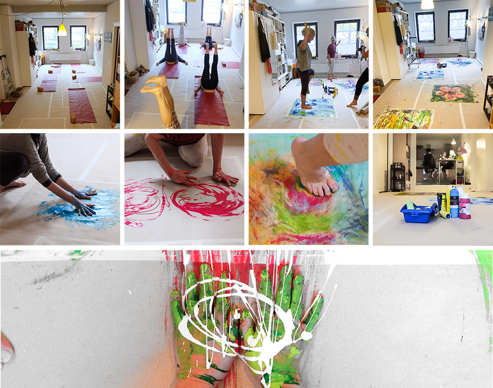 Mit Yoga & Farbe... Händen, Füßen, Schwamm und Stift … Strichen und Fläche … mit gedrücktem, abruptem oder fließendem Körpereinsatz …