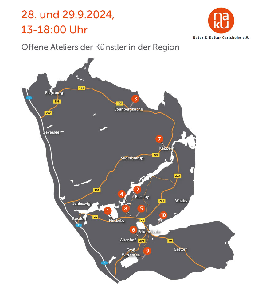 Dem Verein Natur und Kultur Carlshöhe e.V. (Naku e.V.), gehören zahlreiche Kunstschaffende an, die ihre Ateliers in der Region zwischen Kiel und Flensburg betreiben. Am 28. und 29.9.2024 werde diese das erstemal gemeinsam geöffnet.